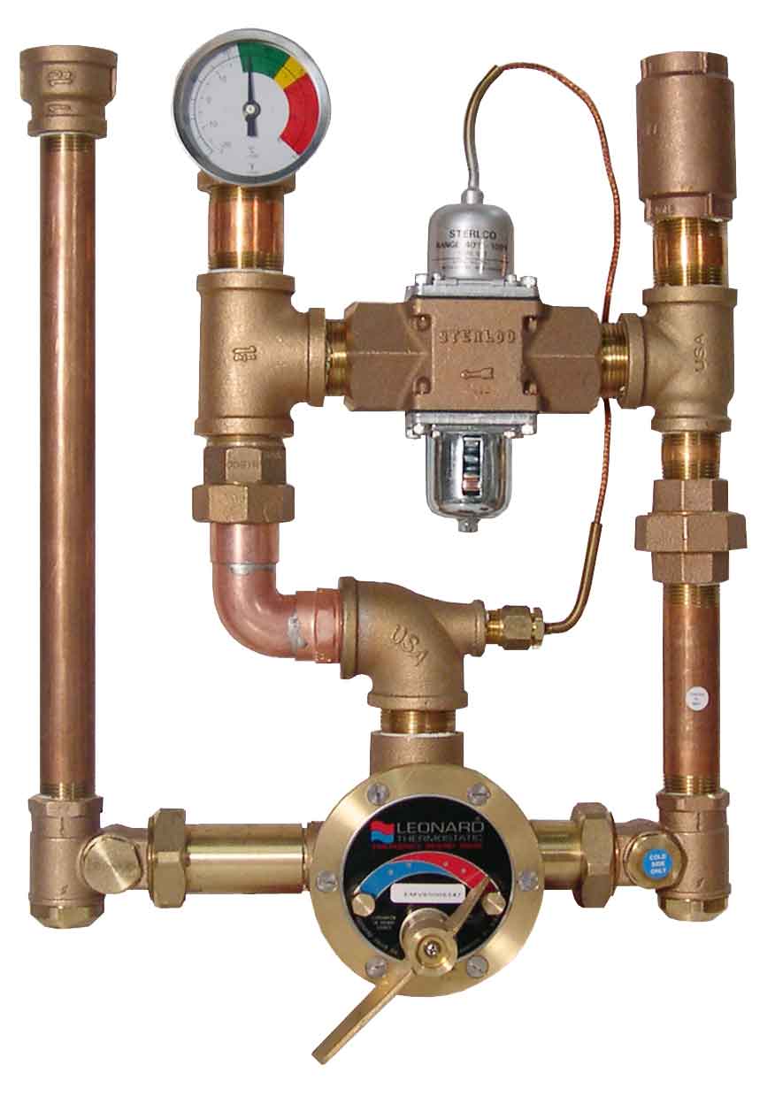 • DURA-trol® solid bimetal thermostat directly linked to valve porting . DURA-trol® is highly responsive and cannot be damaged by extremes in temperature • Primary valve can be set to the correct temperature for the application. • Locking temperature regulator to prevent accidental movement set for 85ºF (29ºC) • Primary mixing valve will close down on failure of cold water supply • Primary Mixing Valve with special internal cold water bypass capable of 20 GPM (76 l/min) @ 30 PSI (2.1 Bar) upon failure of hot water supply • Adjustable high temperature limit stop set for 90ºF (32ºC) • Dial thermometer (range 0 to 140°F, -10 to 60°C) • Union Angle checkstops with strainers on inlets • Secondary Thermostatic Control factory locked @ 90°F, 32°C(adjustable from 40°F to 100°F, 4°C to 32°C) to allow cold water to enter the outlet side of the Primary mixing valve. • Rough bronze finish To determine the amount of Hot Water needed to maintain a steady outlet temperature for 15 minutes, click Hot Water Requirements. This guide is not meant to be used as a means to size the hot water heaters but rather to illustrate consumption.