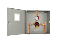 ECO-MIX ™ DURA-trol® solid bimetal thermostat directly linked to valve porting to control the intake of hot and cold water and compensate for supply temperature and pressure fluctuations. DURA-trol® is highly responsive and cannot be damaged by extremes in temperature. Thermostatic Mixing Valve can be set to the correct temperature for the application. Locking temperature regulator to prevent accidental movement set for 85°F (29°C), Recommended Hot Inlet Temperature 140°F. Mixing valve will close down on failure of cold water supply. Mixing valve with special internal cold water bypass capable of 20 GPM (76 l/min) @ 30 PSI (2.1 Bar) upon failure of hot water supply. Adjustable high temperature limit stop * set for 90°F (32°C), Integral wall support, Full 3/4” bottom or top inlets and 1” top outlet, View port in door with Dial thermometer (range 0 to 140°F, -10 to 60°C), Rough bronze finish, Exposed stainless steel cabinet with hinged door and cylinder lock, Angle checkstops on inlets To determine the amount of Hot Water needed to maintain a steady outlet temperature for 15 minutes, click Hot Water Requirements. This guide is not meant to be used as a means to size the hot water heaters but rather to illustrate consumption. This product provides tepid water per the requirements of ANSI Z358.1 This product is certified to meet Low Lead requirements of wetted surface area containing less than 0.25% lead by weight