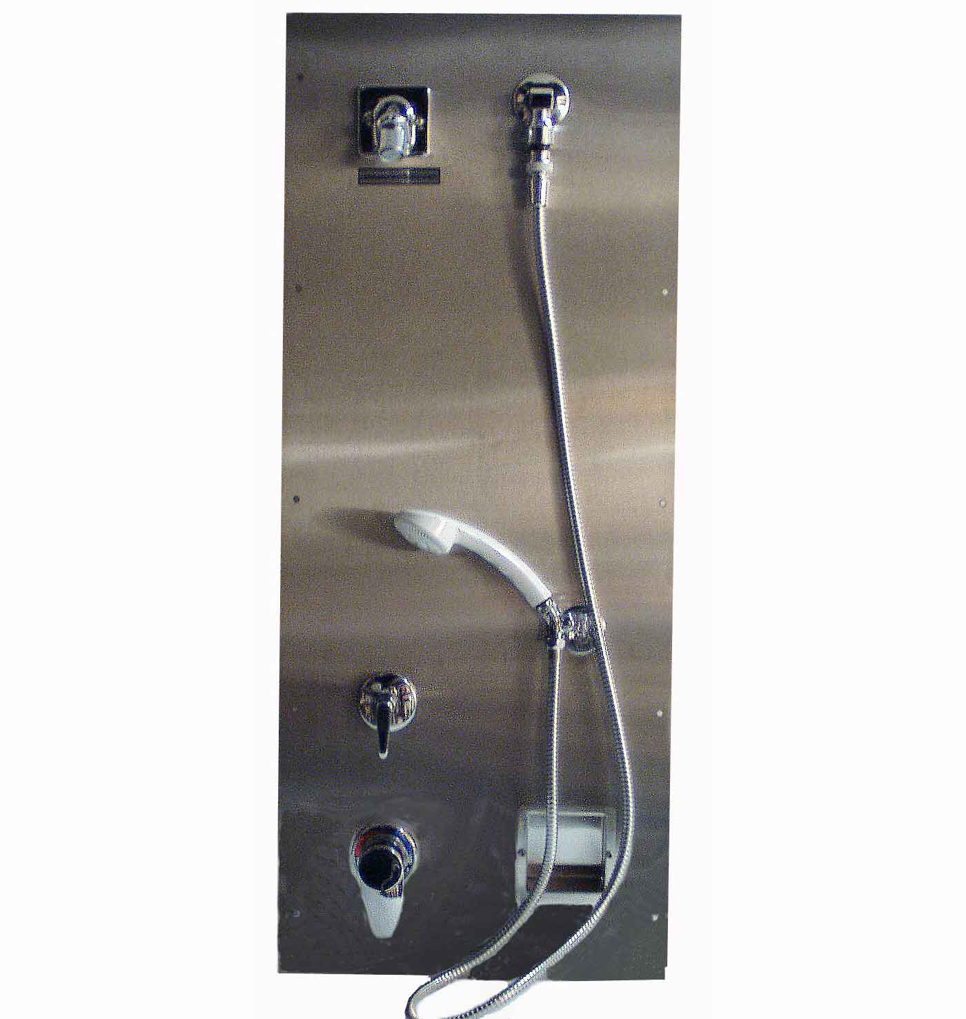 SS-5700 Barrier-Free ADA Compliant Recessed Shower System This system is designed to comply with ADA guidelines on mounting heights, operation and clearances. NOTE: Verify dimensions with local codes. Standard Equipment includes: Shower Panel 16 gauge stainless steel, #4 finish with recessed soap dish. Leonard PAM®-II Pressure Balanced Shower Mixer, lever handle operation, inlet stops. H-06 Institutional shower head, fixed spray, 2.5 GPM (9.5 l/min), vandal-resistant. Lever Diverter Valve Hand-Held Shower with 69"hose, inline vacuum breaker Horizontal Corner Grab Bar Barrier Free Seat