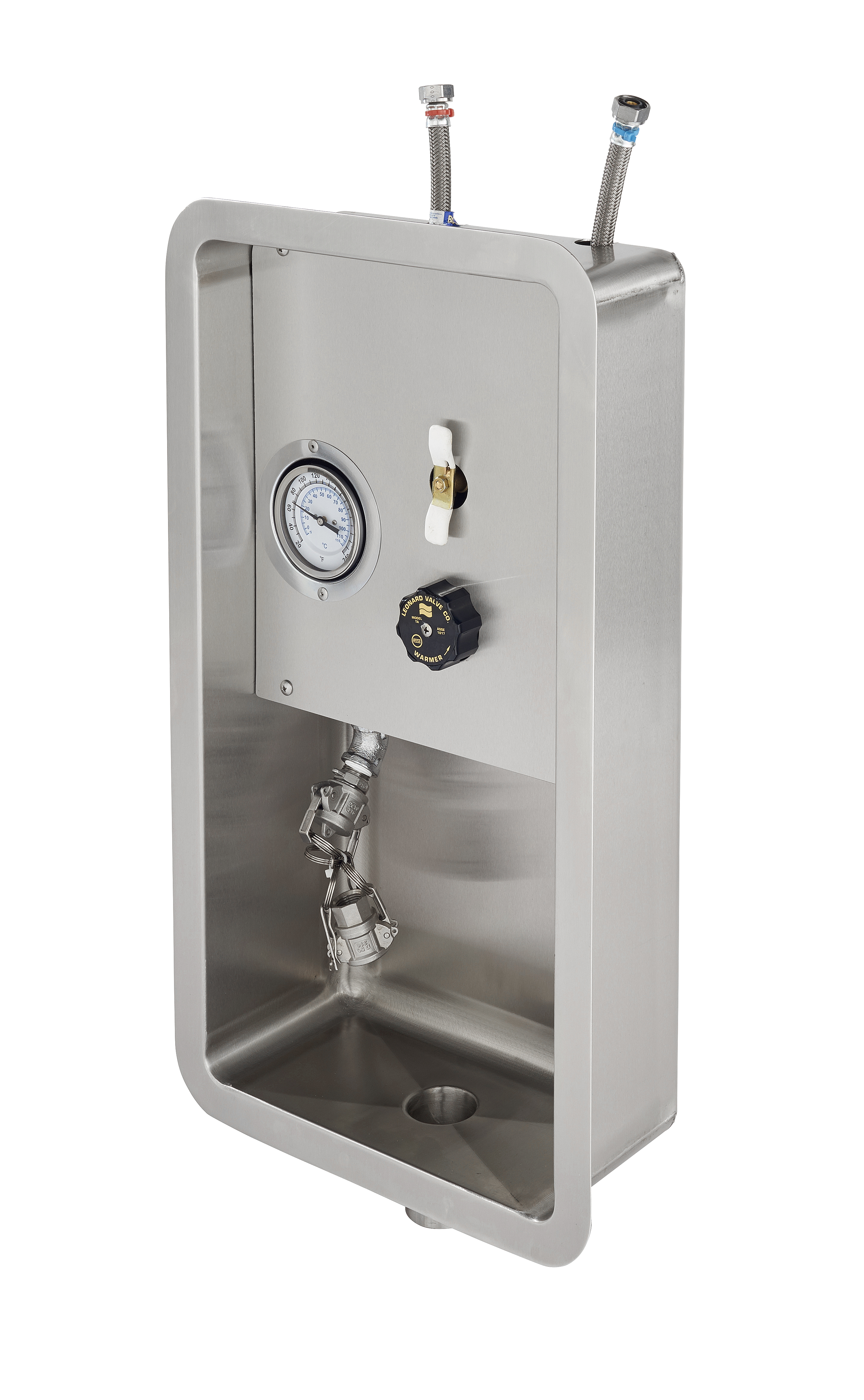 This special system provides controlled low flow water temperature for dialysis using a Leonard TAP thermostatic water mixing valve, powered by the DURA-trol® solid bimetal thermostat. The mixed water outlet assembly includes an atmospheric vacuum breaker, dial thermometer, on-off valve and quick coupler with dust cover. The unit is mounted in a type 316 stainless steel cabinet with drain, flange and panel. Factory assembled and tested.