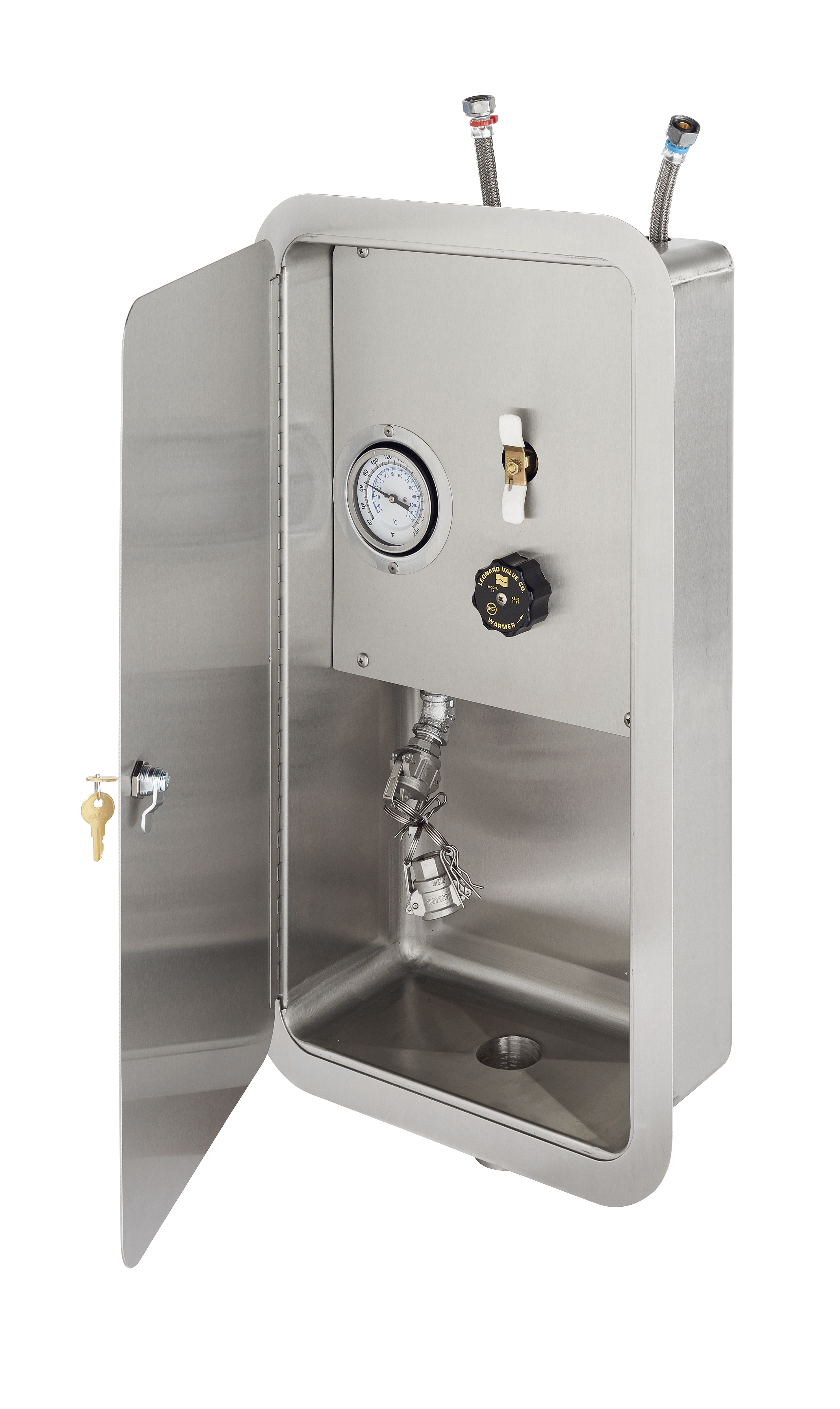 This special system provides controlled low flow water temperature for dialysis using a Leonard TAP thermostatic water mixing valve, powered by the DURA-trol® solid bimetal thermostat. The mixed water outlet assembly includes an atmospheric vacuum breaker, dial thermometer, on-off valve and quick coupler with dust cover. The unit is mounted in a type 316 stainless steel cabinet with drain, hinged door, flange and panel. Factory assembled and tested.