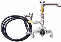 Thermostatic Water Mixing Valve with 1.5 GPM (3.7 l/min) minimum, flow capacity, Integral combination checkstops with wall support, 125 PSI (8.6 BAR) maximum perating pressure, Copper encapsulated thermostatic assembly with Teflon coated stainless steel shuttle, Locking temperature regulating handle, Internal parts of brass, bronze and stainless steel, Outlet volume control / shutoff, vacuum breaker, with Extra 1/2" hose attachment, Ball valve shutoff, Vacuum breaker, 9 feet (2.7m) of 3/8" rubber hose, rose spray, wall hook. Factory assembled and tested.