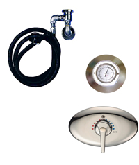 temperature and pressure changes, Built-in shutoff for single handle operation, Integral checkstops, Cast wall flange and lever handle, polished chrome plated, Maximum operating pressure: 125 PSI (860 KPA), Adjustable high temperature limit stop set for 110F (43C), Dial thermometer (25 to125ºF), with wall flange and, mounting bracket, Elevated vacuum breaker with hose connection, 6 feet (1829mm) of rubber hose, wall hook, ½” sweat inlets and outlet, threaded bottom outlet.