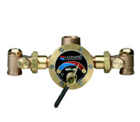 DURA-trol® solid bimetal thermostat directly linked to valve porting to control the intake of steam ( or hot ) and cold water. DURA-trol® is highly responsive and cannot be damaged by extremes in temperatures. Integral combination checkstops with all stainless steel internal parts, Color coded scale: Cold to Hot, high temperature limit stop. Heat resistant temperature adjusting lever. Integral wall support