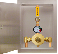 Thermostatic water mixing valve, Copper encapsulated thermostatic assembly with Teflon coated shuttle Lead free (ECO-MIX ™) Combination checkstops, unions on inlets, wall support Locking temperature regulating handle. Tempered outlet ball valves, Color coded dial thermometer (0 to140ºF, -10º to 60ºC). Recessed Stainless Steel cabinet, with door, left hand hinge and flange, cylinder lock, Rough Bronze finish. Bottom inlets, top outlet Factory assembled and tested