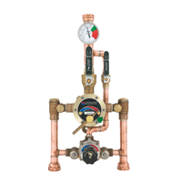 Provide factory assembled and tested large TYPE TM thermostatic water mixing valve, small TYPE TM valve, DURA-trol® solid bi-metal thermostat (directly linked to valve porting to control the intake of hot and cold water and compensate for supply temperature or pressure fluctuations) with Ten Year Limited Warranty, color coded dials (HOT-COLD with directional indicators), locking temperature regulator handles, adjustable limit stops set for 120°F (49°C), integral hot and cold supply checkstops, outlet ball valve shutoffs and color coded dial thermometer, inlet piping manifold, factory preassembled and tested, rough bronze finish System shall provide full time standby service should one mixing valve require maintenance and shall be piped according to Leonard’s required piping method.