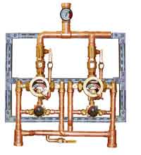 Large Type TM Thermostatic water mixing valve, adjustable high temperature limit stop*, inlet checkstops, wall support, outlet ball valve, Small Type TM thermostatic water mixing valve, adjustable high temperature limit stop, inlet checkstops, outlet ball valve, 2" inlets, 2" outlet (51mm X 51mm), 2 GPM (8 l/min) minimum flow capacity, Inlet/Outlet manifold piping, Locking temperature regulators, Factory assembled and tested.