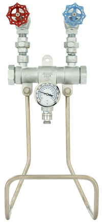 Steam is instantly shut down upon water supply failure, 3/4” IPS inlets and outlet. Two stop and check valves with color coded heat-resistant handles, and all stainless steel internal components. Interior stainless steel control assembly, Manually adjustable temperature, Outlet dial thermometer (20 to 240°F, -5 to 115°C), Backflow preventer with hose connection, Stainless steel hose rack, Maximum pressure 80 PSI (552 KPA), Maximum operating temperature 200°F (93°C)